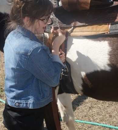 Luego tire de la correa hacia arriba para apretar la correa alrededor de la circunferencia del caballo. (Foto 2)