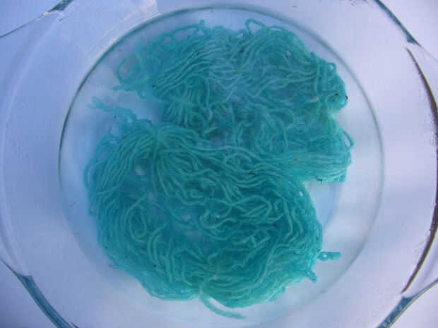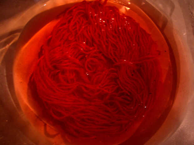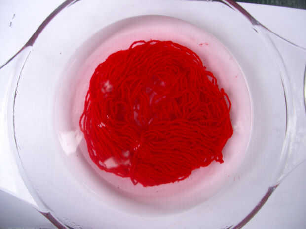 Si el dyebath agota (vueltas incoloros) antes de que el hilo sea bastante oscuro, no hay problema. Sólo Retire las madejas temporalmente el plato mientras añades más Kool-Aid como en el paso anterior. Se podría agregar un sabor diferente para conseguir un color mezclado, por ejemplo, una pequeña cantidad de Stawberry (rojo) en la parte superior (amarillo) de limonada le dará naranja.
