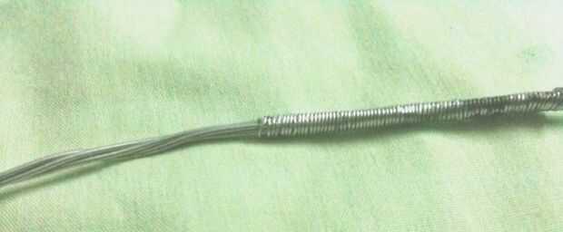 Mantener los 4 con un broche aprietapapel unos 6" de un extremo. Envuelva el alambre fino alrededor por cerca de 2" o menos.