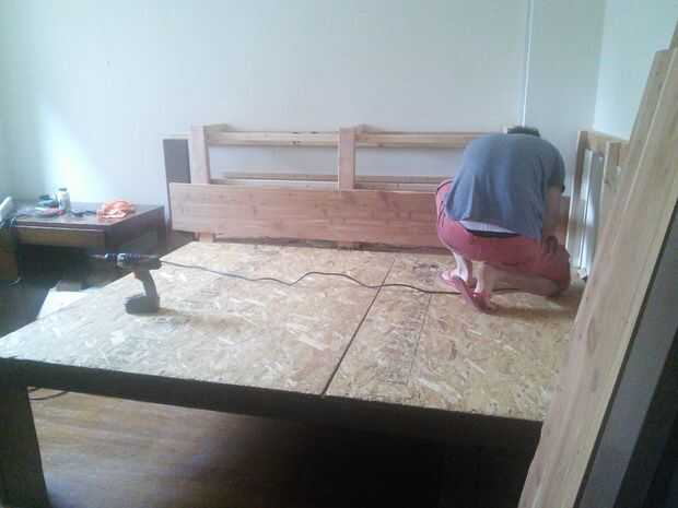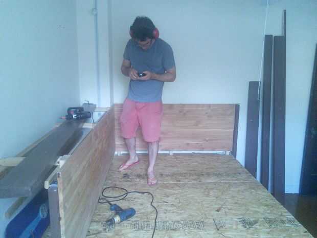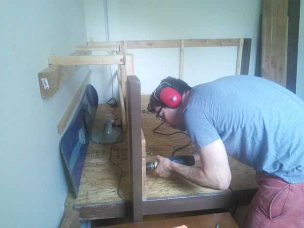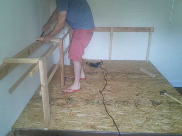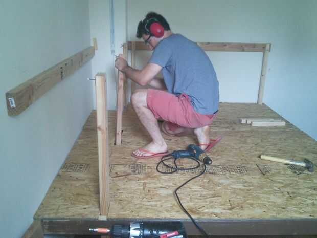 Terminar la estructura, en las fotos muestra cómo el 2x4s vertical fueron atornillados a la plataforma después de instala la tarima. Tuve que muesca hacia fuera y caer... Esto podría evitarse. La pieza superior se instala directamente en la pared. A partir de ahí 2 x 2 se utilizó a la estructura del tablero de lado hacia la pared.