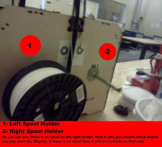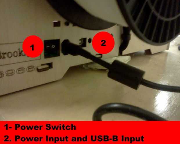 Las diferentes partes en la parte posterior del Bot incluyen: interruptor de corriente, asegúrese de girar el Bot y apagar; potencia de entrada; USB-B entrada, aunque puede conectar el Bot a la computadora, se recomienda no botón de reset; y los titulares de la bobina izquierda y derecha, los anillos en la parte trasera que sujeta las bobinas del filamento ABS.