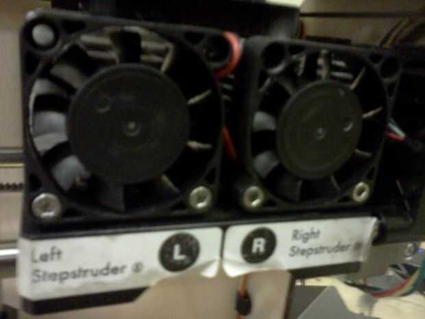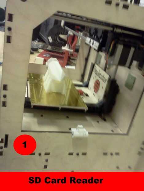 Incluyen las diferentes partes al frente del Bot: stepstruder doble, unido al Monte; construcción de plataforma, lo que se imprimirá la parte a; Guía de filamento los tubos, los tubos en la parte superior de la stepstruder que los filtros de plástico aunque desde atrás hacia delante; y ranura para tarjetas SD.