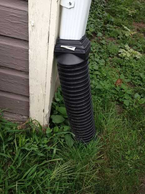 Ya que mi pipa en el suelo corrió justo pasado el garaje, tuve la bajada del garaje así como de la descarga en. Para ello, corté el tubo corrugado negro, agrega una T y dirigido el tubo hacia arriba, con la bajada de agua. Para el garaje, he utilizado un adaptador bajante sin un protector de la hoja ya que no hay árboles cerca bastante para que el canal para obtener obstruido.