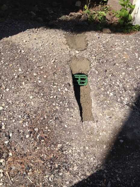 La imagen muestra un terraplén de asfalto que es la base para el garaje. Cavé la fosa inmediatamente detrás del garaje. Para obtener el agujero en el asfalto, he utilizado un martillo de goma y un cincel. Tomó unas cuantas horas de golpeando al llegar el agujero en forma de la manera que quería.