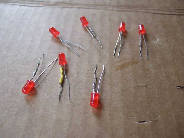 Solde un resistor de (150-220 ohmios es un buen valor) directamente sobre el cable de negativo de algunos LED. Te enciende de alrededor de 2v-6v sin quemar.