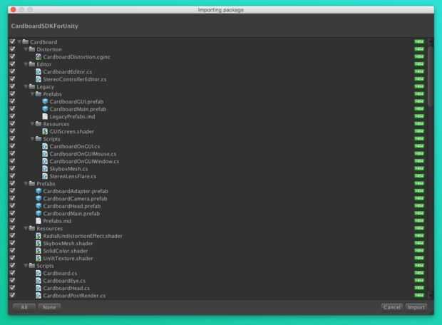 El proyecto de unidad vacío todo listo viene con dos componentes en la jerarquía: una cámara y una luz direccional (sol). Sin embargo, cartón proporciona su propia cámara con visión estereoscópica y distorsión óptica.