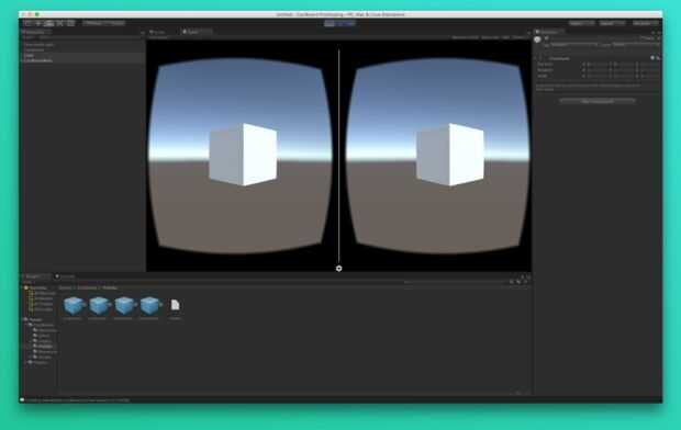 - Ahora pulse el botón de play en la parte superior de la ventana. Se le presentará con el entorno de VR en la vista de juego, prestado desde los dos miradores (debe ver algo como la imagen de arriba). Manteniendo pulsado alt mientras mueve el cursor puede mirar alrededor.