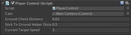 - Con el objeto del jugador seleccionado, haga clic en el círculo junto a la propiedad 'Cam' del componente en el inspector de Control de jugador. Seleccione la cámara principal como cámara. La secuencia de comandos utiliza esta cámara para determinar la dirección en.