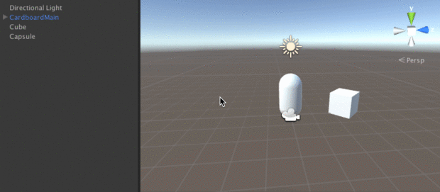 - Arrastre el objeto de CardboardMain encima de la cápsula de jugador (lo que es un 'niño' de la cápsula). Utilice la herramienta mover para colocar la cámara aproximadamente a la altura de ojo.