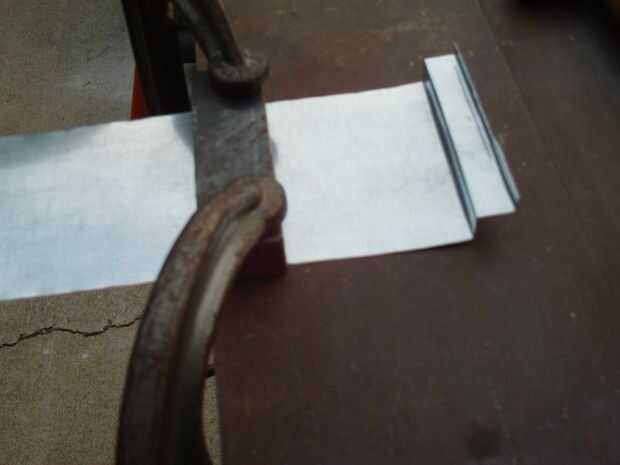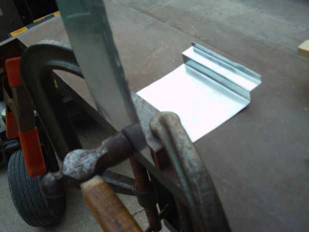 Con la Junta de marco lado empujada contra la curva del perfil de entrada en el metal de hoja, haga una marca en la chapa metálica que muestra dónde está la parte posterior de la Junta de marco lateral. Para ello en cada lado de la chapa. Luego trace una línea entre las dos marcas y esto será donde tendrá que hacer su primera curva para cerrar en el alimentador. Demandé un trozo de barra de acero y sujeta en mi linea a una mesa de metal. Entonces había doblado la chapa hasta 90 grados. Tomé un martillo para golpear ligeramente a lo largo de la línea de plegado para hacer una agradable esquina cuadrada. Esto completa la primera curva.
