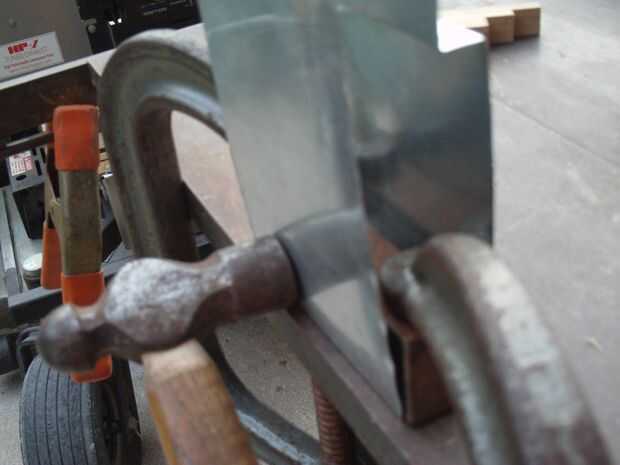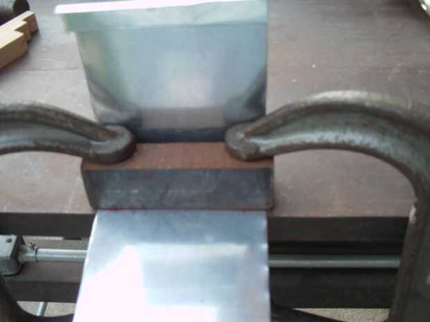 Una vez más usted tiene que mantener el tablero del marco lateral en lugar y haga una marca en la chapa para indicar donde debe estar la línea de plegado. (Hacer esto tanto a izquierda como a derecha de la chapa). Dibujar una línea entre estas dos marcas y fíjela a la tabla con una barra de acero a lo largo de la línea de plegado. Un buen trozo de podría utilizarse en lugar de la barra de acero. Doblar la chapa hasta 90 grados y golpee con un martillo para hacer una bonita curva cuadrada. Cuando haya terminado, la chapa debe encajar muy bien en el tablero del marco lateral.