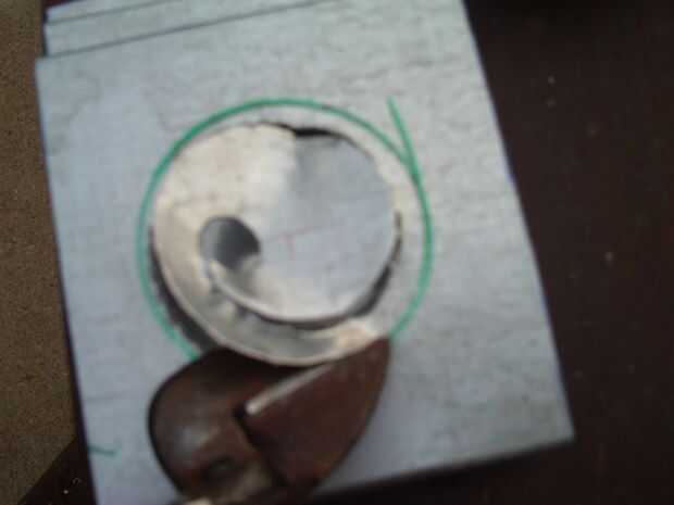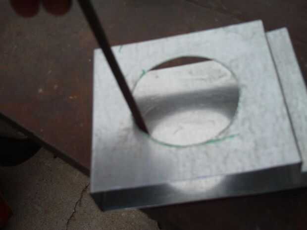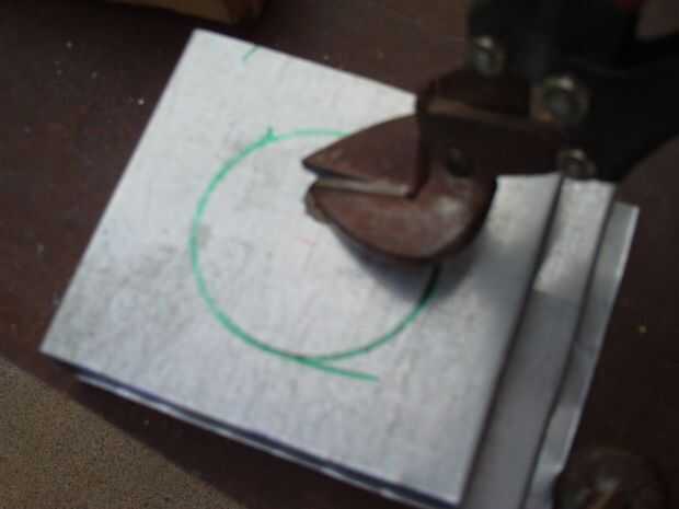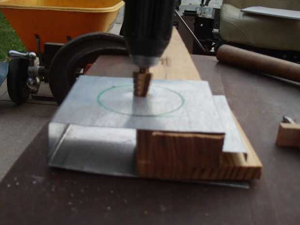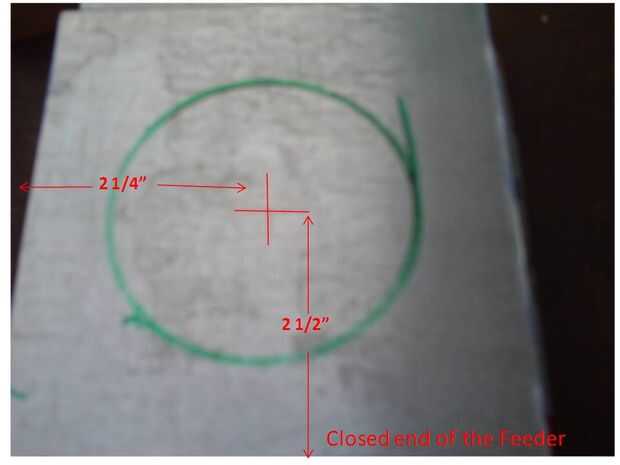 Coloque una tapadera en la parte superior del alimentador. Localizar el centro de aproximadamente 2 2" desde el extremo cerrado del alimentador y centrado lado a lado. Marque alrededor de la tapa y haga un orificio de 3/4" dentro de la marca. Usé una broca de paso. Entonces tomé una tijeras de chapa y corte cuidadosamente una forma espiral a la línea. Hice esto con el fin de obtener un corte más suave. También encontré por incrementos pequeños del corte, que el corte salió más suaves. Tomar una lima redonda medio para suavizar el borde de corte. Mantener comprobando el ajuste de la tapa hasta que se ajusta libremente en el agujero y no caiga a través. Una Dremel puede utilizarse también para suavizar el agujero. Puede utilizarse también un serrucho para cortar el agujero si uno tiene el tamaño correcto. En este momento Asegúrese de que todos los bordes afilados se presentó y luego alisados con Scotch Brite.
