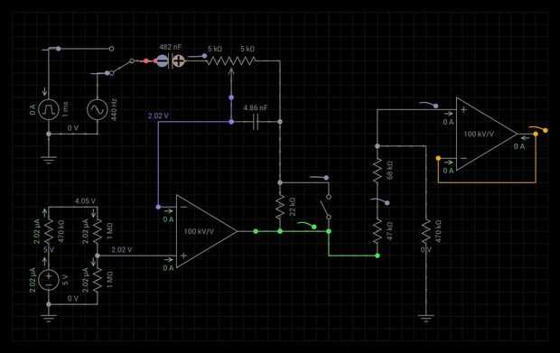 La señal de la guitarra es modelada por un generador de señal en la esquina superior izquierda del diagrama. También hay allí un interruptor que puede usarse para suministrar una onda cuadrada en el circuito simulado. Este donde una toma de entrada de guitarra estará en la construcción.