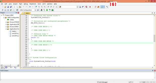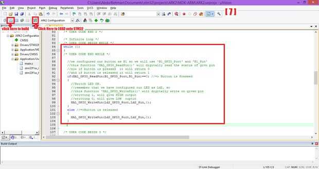 //we configured our button as B1 so we will use 'B1_GPIO_Port' and 'B1_Pin'//this function 'HAL_GPIO_ReadPin()' will digitally read the status of givn pin//now if button is pressed it will return 0//and if button is released it will return 1if(HAL_GPIO_ReadPin(B1_GPIO_Port,B1_Pin)==0) //=> Button is Pressed{ //Switch LED ON. //remember that we have configured our LED as Ld2, so //this function 'HAL_GPIO_WritePin()' will digitally write on given pin //writting 1, will give HIGH output //writting 0, will give LOW ouptut HAL_GPIO_WritePin(Ld2_GPIO_Port,Ld2_Pin,1);}else //=>Button is released{ HAL_GPIO_WritePin(Ld2_GPIO_Port,Ld2_Pin,0);} Ahora, usted Keil ventana debería tener este aspecto: