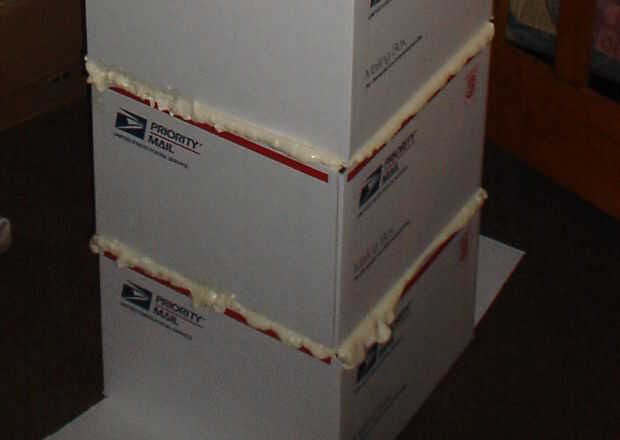 Con aislante de espuma en spray, spray entre las cajas. Deje que este seco, luego raspar hacia abajo de la espuma en exceso.
