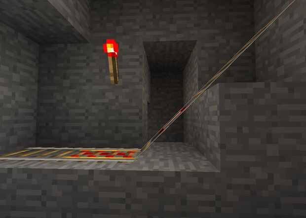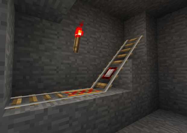 Ya que queremos que la vagoneta a caer hacia abajo (preferentemente sin atascarse), necesitamos los carriles a ser diagonal. El paso 3 x 1 debe tener otro carril colocado en él sólo para recorrer el carril final a un estado diagonal. Después de eso, romper el carril y coloque un bloque sobre él. Fotos 3 y 4 muestran cómo se hace.