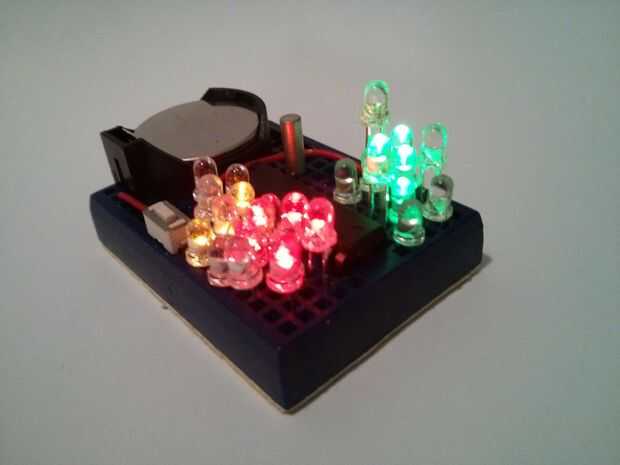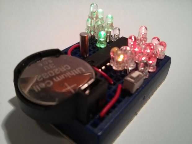 entradas reloj joyas funciona como un reloj de entradas, en que dices tiempo contando el número de LEDs. Para mi diseño, un solo LED azul en la parte superior izquierda de la constructindicates 10 de una hora. Grupo derecho superior del LED verde indica las horas (2 dígitos).