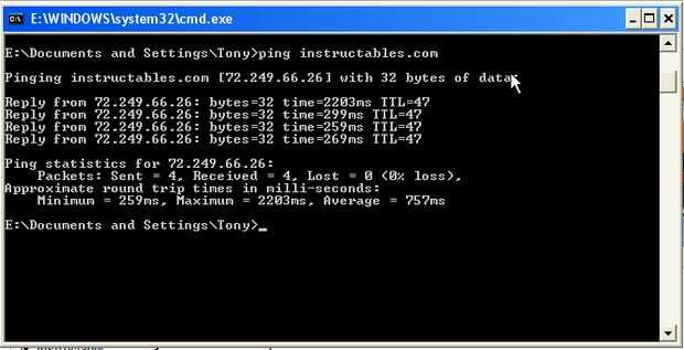 Para hacer ping a un sitio tipo en "ping (aquí en su sitio)" - reemplazando el (su sitio aquí) con una url y quitar las comillas. Continuación, presione Entrar. por ejemplo, ping instructables.com