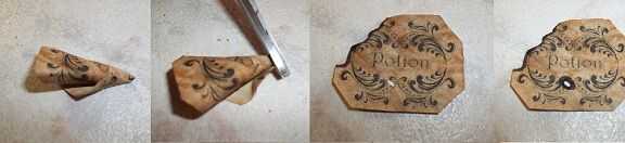 Quemaduras pueden ser en forma de pequeños agujeros creados cuando aterrizó en la etiqueta de ceniza caliente y smoldered brevemente. Tal vez el borde de la etiqueta se incendió en una explosión espantosa elaboración de pociones y quemó un poco de lo lejos. Porque algunas de estas etiquetas son muy pequeñas, decidí realmente les ardiendo como incluso una quemadura controlada podría char más de lo que deja atrás. En cambio, ingeniosamente cortar las etiquetas y utiliza un marcador de tinta permanente a "char" a lo largo de los bordes cortados.