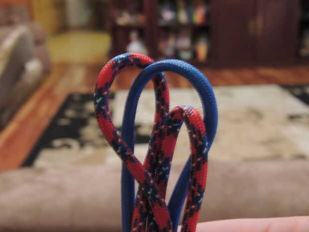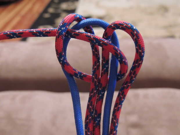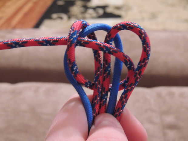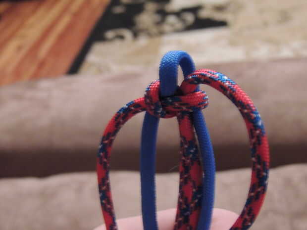 Lazo de la rama izquierda de filamento dos filamento uno y vuelta a través del lazo en el lado izquierdo. Lazo el extremo mismo alrededor a la derecha, va entre el extremo del filamento uno y el otro extremo del hilo dos, y entonces a través del lazo usted anteriormente en este paso. Tirar de ello para hacer el nudo apretado.
