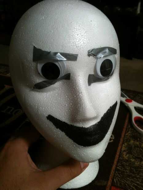 En primer lugar, crear la cabeza combinando la ojos saltones y la máscara, a la cabeza de espuma. Crear los "hombros y columna vertebral" comprimir juntos dos piezas de pasadores de madera ligeras.  Mina envuelta en cinta adhesiva para mayor rigidez.  Cubierta con una camiseta de manga larga.
