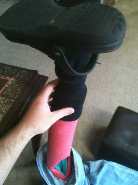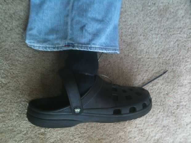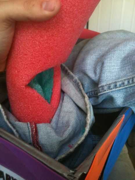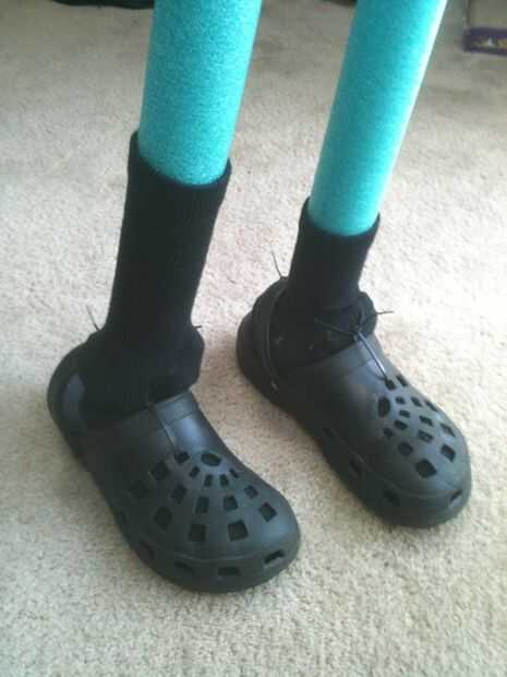 Una vez que el cuadro está listo, usted querrá hacer los zapatos (o compra, si tienes los medios). Usa un pañuelo y algun pegamento modelado y rápidamente hizo multicolor se cuela por el "payaso". Les sería rehacer con más tiempo, pero por ahora, se ven muy bien. A continuación, son las piernas. He probado muchas versiones diferentes de las piernas, pero me di cuenta rápidamente que debían ser lo suficientemente flexible como para moverse, pero lo suficientemente ligero para que yo no odio al final del día. Tallarines de la piscina de espuma son la mejor opción! Cortar los tallarines, cortar detrás de la porción de "rodilla" así que flop naturalmente sobre el borde de la caja, utilicé "crocs" porque eran ligeros. Ataduras de cremallera se utilizan PESADAMENTE en este paso, especialmente para obtener el pie para doblar en un ángulo de 90 grados natural. Me lleno de calcetines largos-equipo con periódico y rellenos en los zapatos. Utilizando los orificios de los cocodrilos, zip atado al tobillo y el tobillo a los tallarines de la espuma. Esto permitió que el pie permanezca en un ángulo natural, mientras que mantienen el pie a la pierna. Los pantalones vaqueros cubrieron todo muy bien, siendo anchos estilo y todo. Zip-até a quedarse arriba, y las piernas cram down en la caja y se llevan a cabo en lugar con el pecho y el estómago. Las manos de payaso pueden ser pegadas a la parte inferior de la caja, o sólo metidas dentro como yo lo hice. Me gustó el aspecto de las manos en el exterior, por lo que terminé de grabarles debajo para dar la ilusión de que el payaso realmente estaba llevando la caja. Jugar alrededor con su diseño, estoy seguro de que saldrás con algo fresco.
