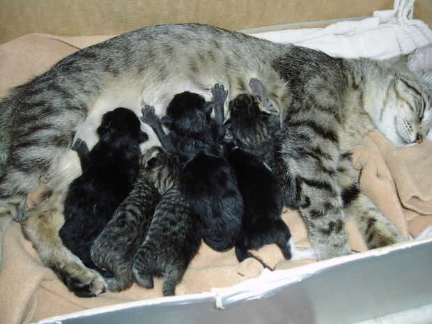 Después de todos los gatitos han nacido y hecho alimentación, usted puede moverlos en el cuadro de gatito. Me mudé todos los gatitos en la caja y Reyka simplemente siguió allí.