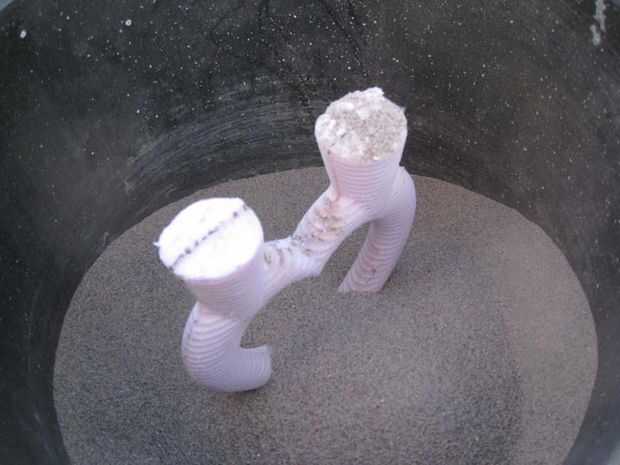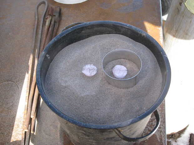 Puede hacer espuma perdida en un número de maneras. Decidí enterrar a mi patrón en arena suelta. Este es el método más fácil y más inmediato pero te da una superficie granulada de la arena. Yo sabía que iba a hacer algún acabado a mi castings por lo que importaba. Tamiza la arena regular del juego en un viejo bote de sopa y me enterró el primer corazón hasta la parte superior de los bebederos. Entonces tomé un corto puede con la parte superior y parte inferior y pone alrededor del lado de entrada. El poder actúa como un cuello para retener el metal y le da un suministro adicional para ayudar a llenar el molde como están vertiendo. También no tienes que ser muy precisos como viertes.