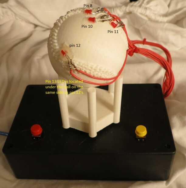 Una vez que tienes el circuito construido para el entrenador de béisbol, el código cargado en el arduino, y el béisbol y béisbol soporte impresos puede comenzar el montaje del entrenador de béisbol. Primero tienes que tomar la caja que vas a utilizar para contener todos los componentes del circuito y perfore un agujero en el centro de la tapa. El agujero debe ser lo suficientemente grande para el motor servo que puede mantenerlo oculto dentro de la caja pero todavía montar el stand de béisbol para el motor. Una vez que el servo se fija a la tapa y luego el béisbol soporte seguro para el motor cinemático. Taladre los agujeros en la tapa para colocar los botones y los botones como el diagrama del circuito pero sin una placa del alambre (soldadura podría ser necesario para ello). Perfore un agujero en la parte posterior de la caja y ejecutar el cable de conexión fuera del agujero y pegar el LED al béisbol en los puntos indicados en la imagen de arriba. El primer conjunto de luces LED es la bola y la bola de nudillo, el segundo conjunto de iluminación LED es la bola curva y el último conjunto de iluminación LED es el cambio. Ahora que ha terminado el entrenador de béisbol Diviértase agregando campos nuevos a su arsenal y convertirse en un lanzador de elite.