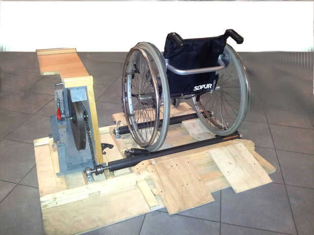 Este gadget es para mover una silla de ruedas en el lugar con fines de acondicionamiento físico. Consiste en 2 rodillos de tubos que llevan la silla de ruedas, una cadena y una rueda volante que se extiende el movimiento del usuario. Para ingresar o ascender más precisamente el gadget, es un freno y una rampa. Unclimbing o dejar el gadget es más sofisticado: con frenos del gadget, el usuario debe asentir la silla de ruedas para ganar impulso y mueva hacia atrás en un estilo de saltos. No es fácil pero funciona. Resistencia por el efecto del entrenamiento se produce por la fricción, por ejemplo, entre las ruedas de la silla de ruedas de goma y los tubos del rodillo. El gadget aquí es para los tubos de la silla de ruedas sin aire.