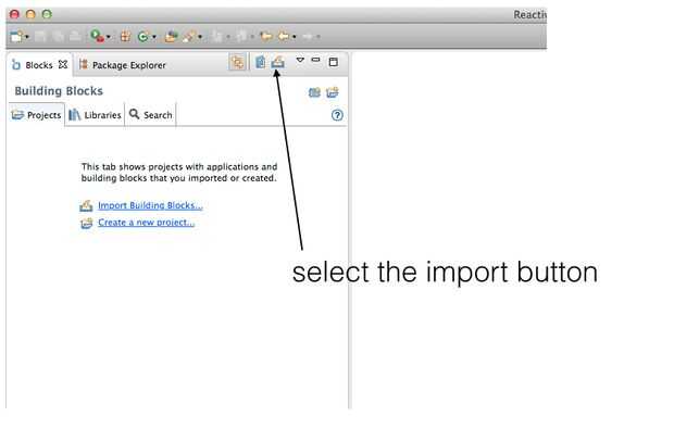 En el editor de Eclipse en el lado izquierdo hay dos diferentes puntos de vista: la vista de bloques y el paquete Explorer. Asegúrese de que usted está en la vista de bloques y seleccione el botón importar