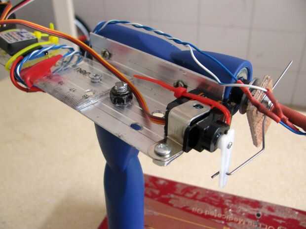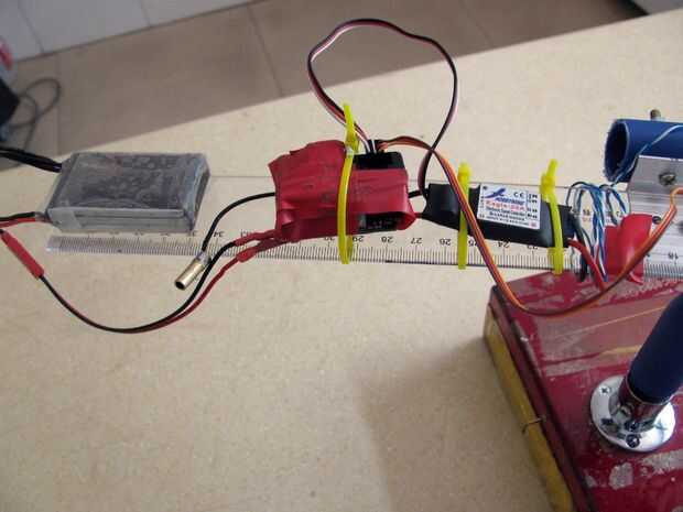 Foto 4: batería, receptor y el controlador del motor unido a la regla de acrílico