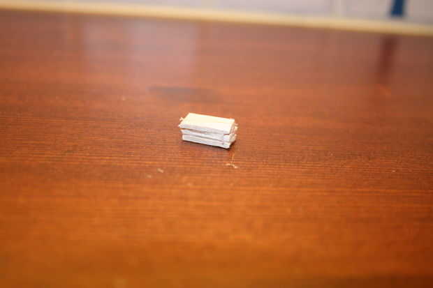 Uno de sus palitos y desmenuzar para que tenga tres piezas de igual longitud. Todos deben ser aproximadamente 1,5 cm(ca.0,6 inches). El resto del palito se puede tirar o hecho para otra ocasión. Ahora pegar las piezas como un sándwich.