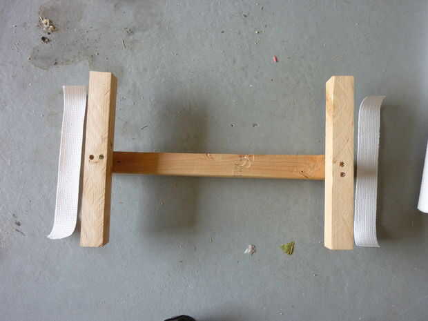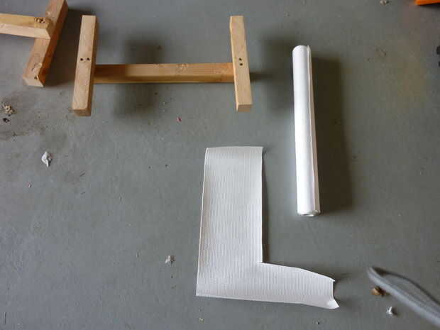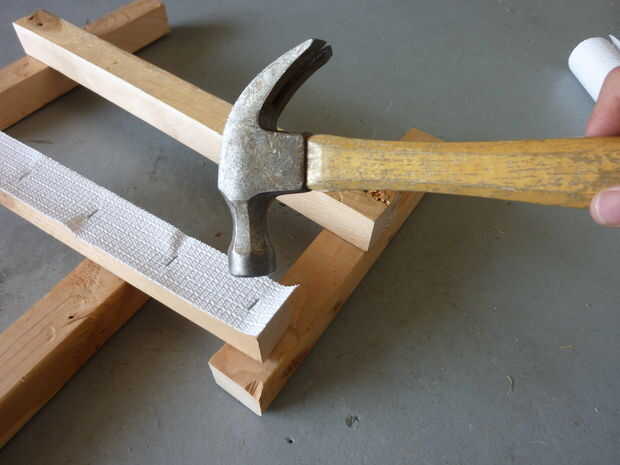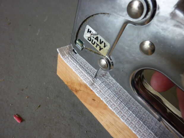 colóquela sobre la madera corta, asegúrese de que el lado del asidero es y entonces usar una engrapadora para grapas pozo. luego utilice un martillo para asegurarse de que las grapas no sobresalen.