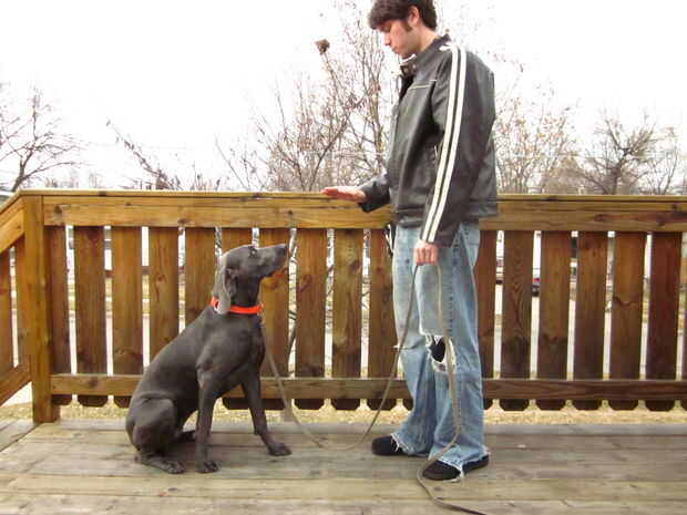 2. parado frente a su perro, decir firmemente 'Stay' al mismo tiempo que la mano señal en el cuadro 2.