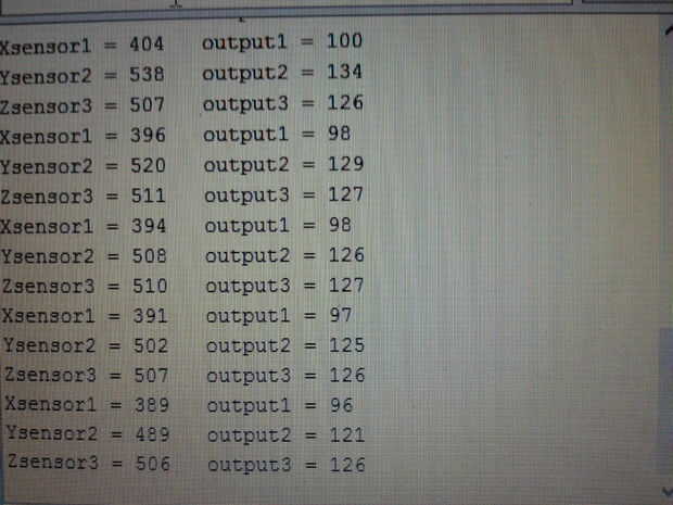 Tres valores para los ejes X, Y y Z se muestran juntos se repiten después de un intervalo de 3 segundos.