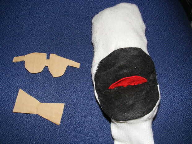 Crear complementos para su muppet calcetín utilizando trozos de cartón y material extra. Fije al calcetín-muppet pegado, ajuste de lazo o costura en.