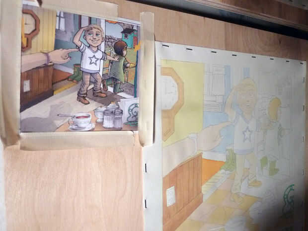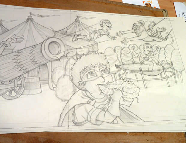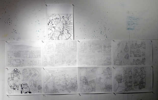 Tenía mi libro del bosquejo conmigo y lo tenía tendido hacia fuera. El chico para que estaba trabajando la vuelta a través de él cuando él me. Al día siguiente me dijo que tenía una epifanía y que necesitaba para empezar a crear algunas ilustraciones para colgar en la pared de tiro (una pared donde fue presentada casi la película entera). Así que tengo un script y empezó a hacer lo que llamamos "fotogramas clave".