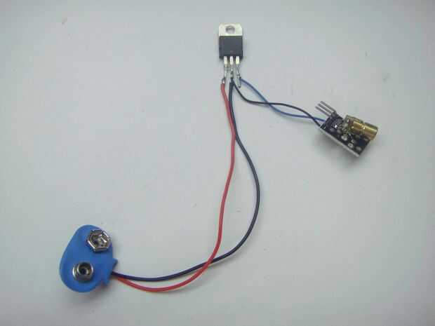 Estoy usando un módulo de láser por un láser. Si no tienes un módulo de láser, puede utilizar un puntero láser. Hay algún módulo de láser que trabajan a 3V y algunos trabajos en 5V, así que asegúrese de que elija la correcta fuente de alimentación para el módulo si no te lo dañará. Tengo un módulo de láser de 5V, así que construí una fuente de alimentación para con regulador de voltaje de 5V y una batería de 9V. El módulo de láser no debe ser alimentado con Linkit uno porque va a ser difícil para usted cuidar del alambre con siempre sería bajo los pasos de varias personas. Que el módulo y pega a la batería de 9V con cinta. Ahora el módulo de láser está listo.