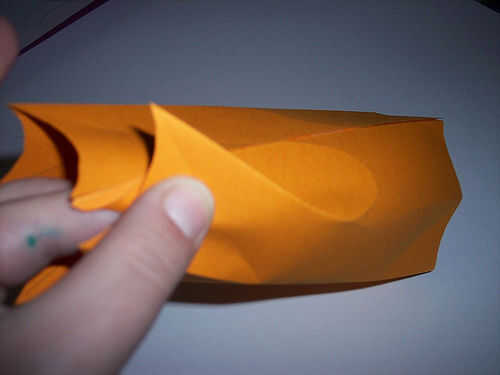 Apriete el borde y plegar en el pliegue ya existente, mientras mantener en su lugar hacer el siguiente y el siguiente hasta que se derrumba en forma de estrella. Mira al lado de fotos para ver la progresión.