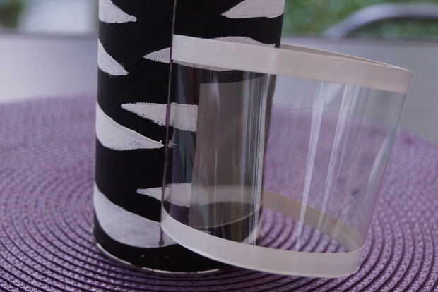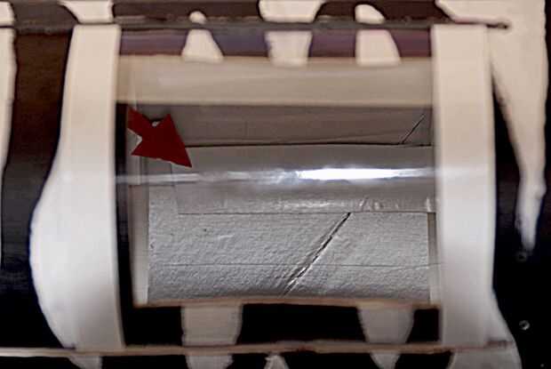 La flecha roja muestra el pedazo de cinta adhesiva que mantiene Unidos ambos extremos. Pero debido a una mano apenas le cabe en la lata para este procedimiento es mejor cuidadosamente vuelta el plástico todo pedazo de modo que ambos extremos de la lata en alcanzar para encintado de juntas. Aquí es mejor globo ocular como bien quieres la puerta, ya demasiado apretado o demasiado flojo significa un deslizamiento más difícil.