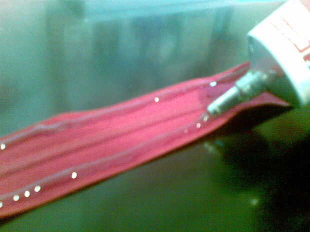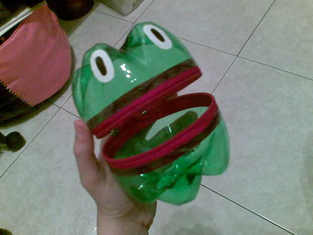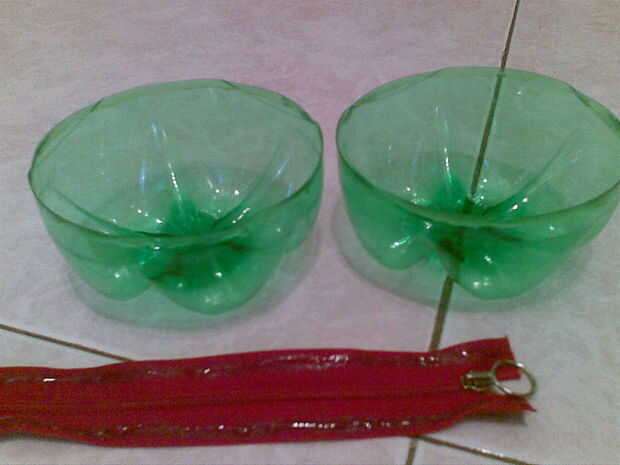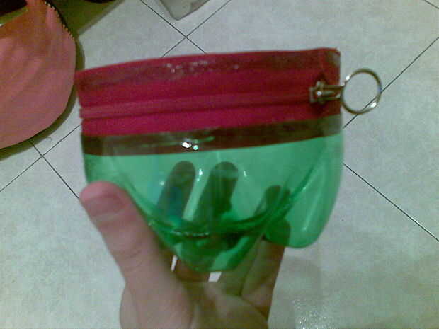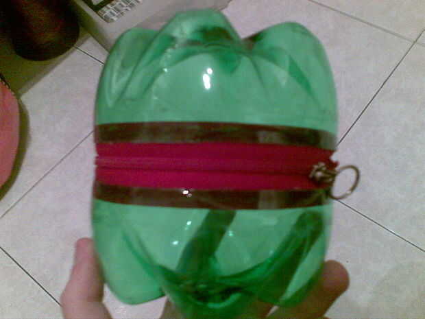 Ahora se unen las piezas. Pegar la cremallera con una botella (con cuidado) y luego con la otra botella (que costará un poco más).