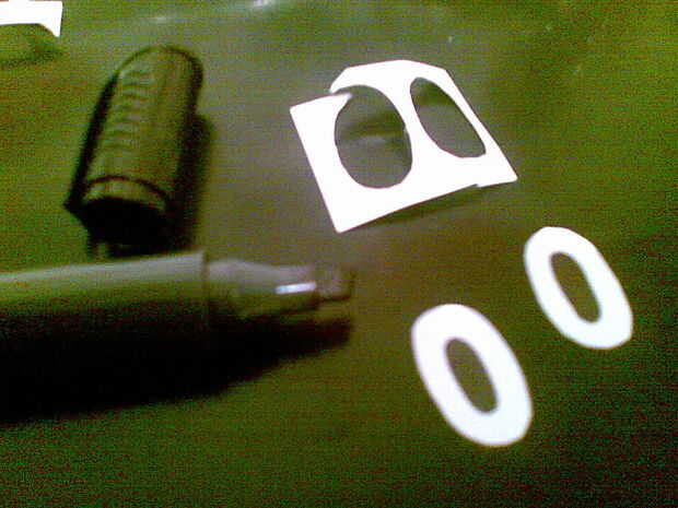 Para los ojos, dibuja dos elipses en el papel de la etiqueta (el tamaño que desee) y recorto. Dibujar un círculo negro como un alumno con una marca y lo pega en la botella.