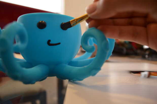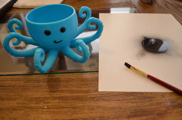 Después de eso, tuve que quitar los soportes, limpiar la pieza y pintar su cara. Limpiado con acetona para darle un aspecto más suave. Y pintaba sus ojos y la boca con pintura a prueba de agua y un cepillo, por lo que se puede lavar sin problema.