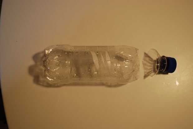 Luego, corte un círculo flojo alrededor del cuello, como en la foto 2. Asegúrese de reciclar la sección botella grande a la izquierda.