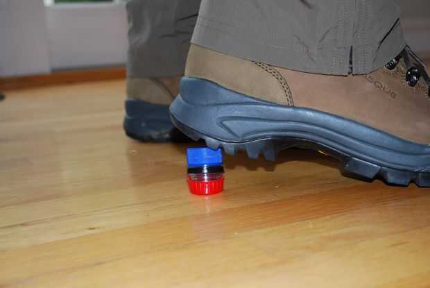 Para obtener las piezas juntas, ponerla bajo su pie, con la pequeña tapa en la parte inferior. En el cuadro dos, lentamente fui poniendo peso sobre mi talón. No tienes al sello abajo en él. Después de escuchar un par de clics, la tapa se coloca a presión en.