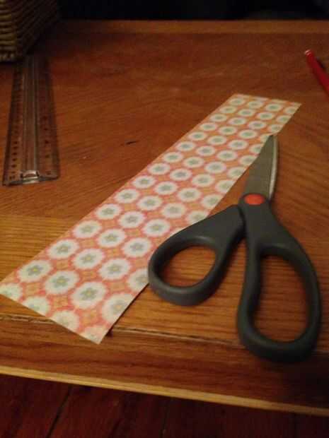 Seleccionar un trozo de papel de scrapbook decorativo. Mida el ancho manteniendo hasta la lata. Dibujar una línea recta uniformemente espaciada usando una regla y corte.