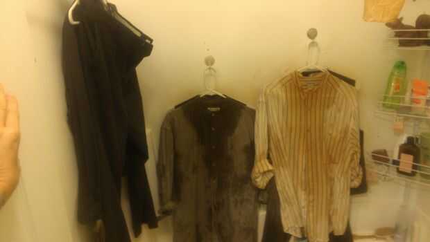 Sudor: Para el sudor seco en mira llené una botella de spray con agua y algunos té helado instantáneo. Usted puede hacer esto como luz u oscuro (débil o fuerte) como quieras. Dejará un tinte amarillento agradable a cualquier cosa que usted rocía en. Asegúrese de que utilizar té sin endulzar. Si utiliza té dulce, el azúcar se goma encima de la botella de spray y terminarás con la boquilla está obstruida. Esta ropa será de manchas así que asegúrate de lo que eres de rociadura está bien siendo un color tan permanente. Remojar la tela en el té es de uso frecuente para hacer blancos más "vintage" así... se llama también "enseñar" y ayuda a asegurar que el blanco brillante no 'sopla' en cámara.