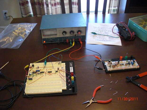 Bueno... eso es una muy buena pregunta. En la escuela secundaria intentó transmitir música a través de la modulación de amplitud con un puntero láser barato y el ruido era insoportable. Resulta luz ambiente creada a una especie de retroalimentación que hicieron mi proyecto muy ineficiente. Si las luces no estaban hacia fuera, el receptor no juega mi señal. Incluso con las luces apagadas, sólo una canción era audible, "Hey Soul Sister" en tren. Así que el propósito de este proyecto era arreglar ese bug. Queríamos poder enviar música en medio del día tan claramente como sea posible. Con FM, podríamos establecer una serie de oscilaciones que se arreglaría. El circuito forma un libre oscilador/modulador de FM en dos veces la frecuencia de operación salida. Este es el núcleo del modulador. La salida es lineal rampa voltaje de desnivel positivo o negativo.