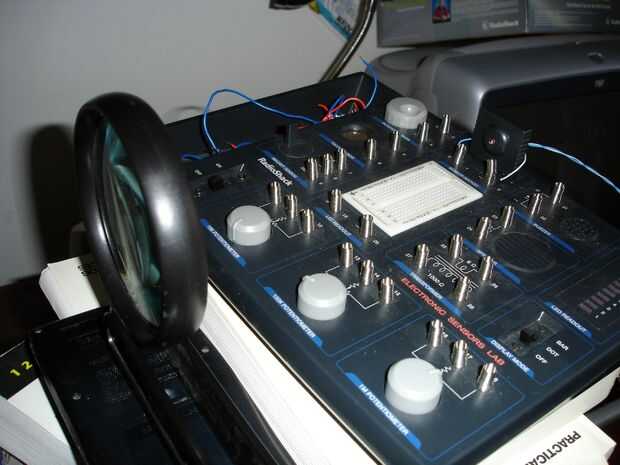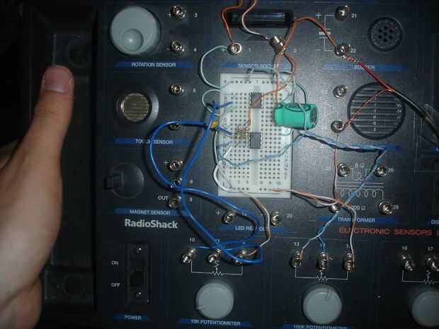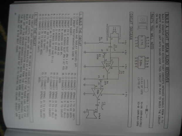 Para este proyecto la ganancia del amplificador es crítica. Debe ser muy alta a variaciones leves de Pick-up en la señal de entrada (luz) para sacar la música. Por lo tanto construir un preamplificador protoboard de RadioShack 50-en-1 Sensor laboratorio protoboard kit, que recomiendo altamente. Revisa las fotos y esquemas del libro incluido.